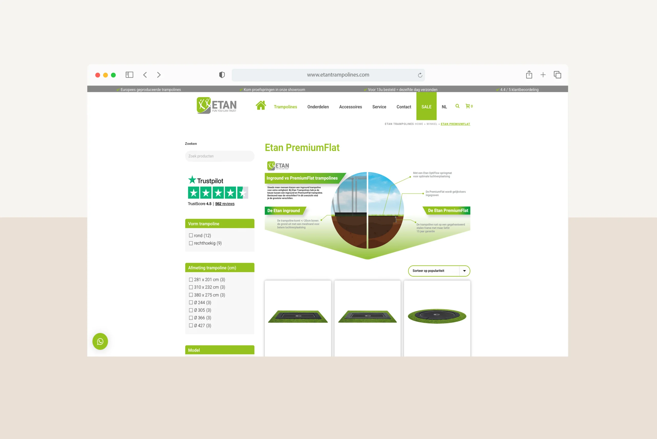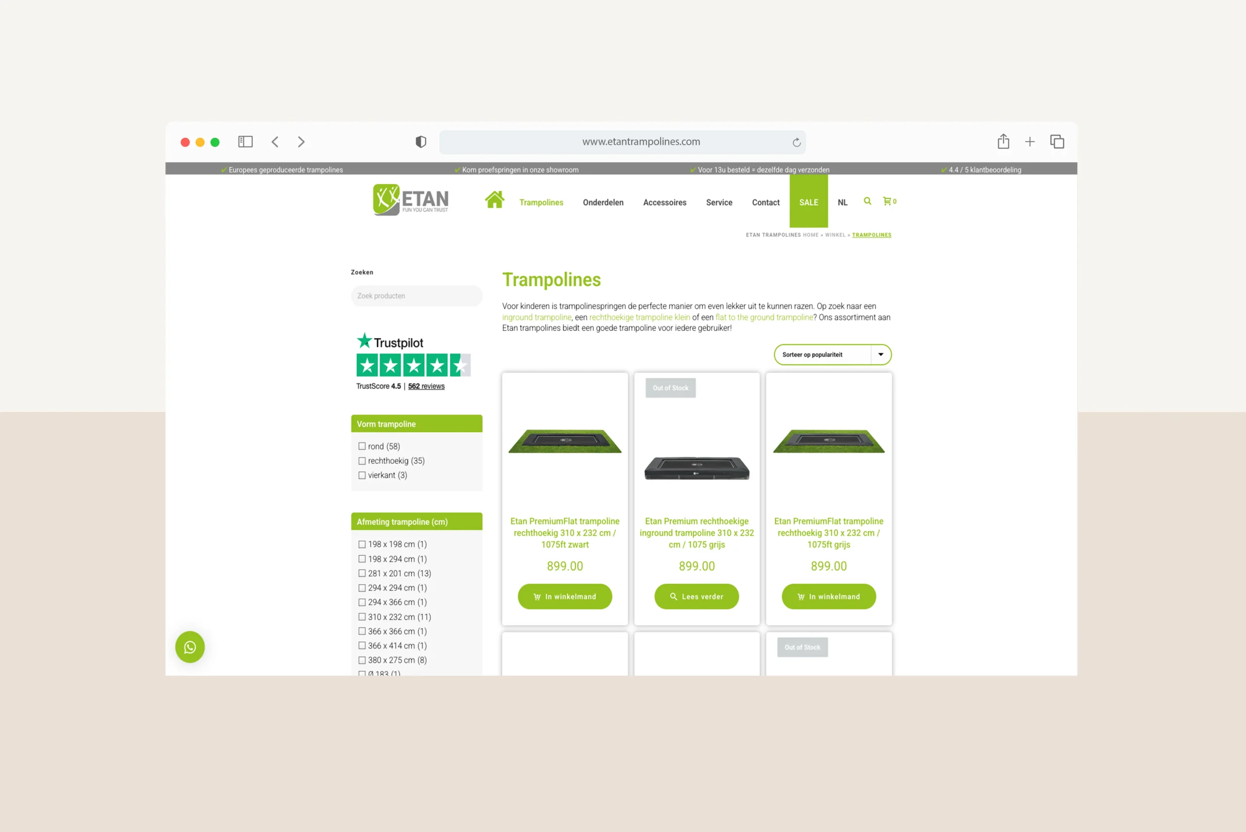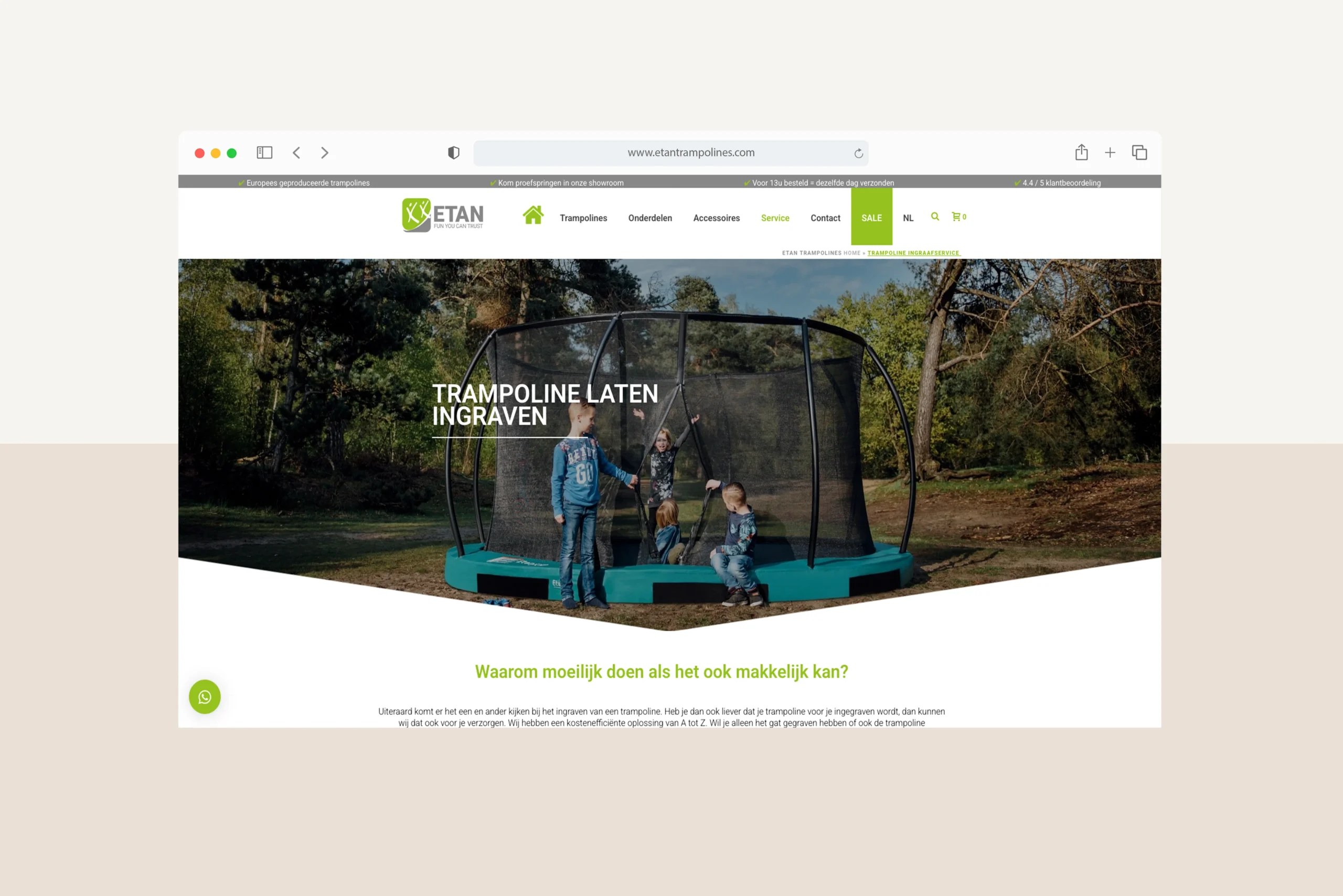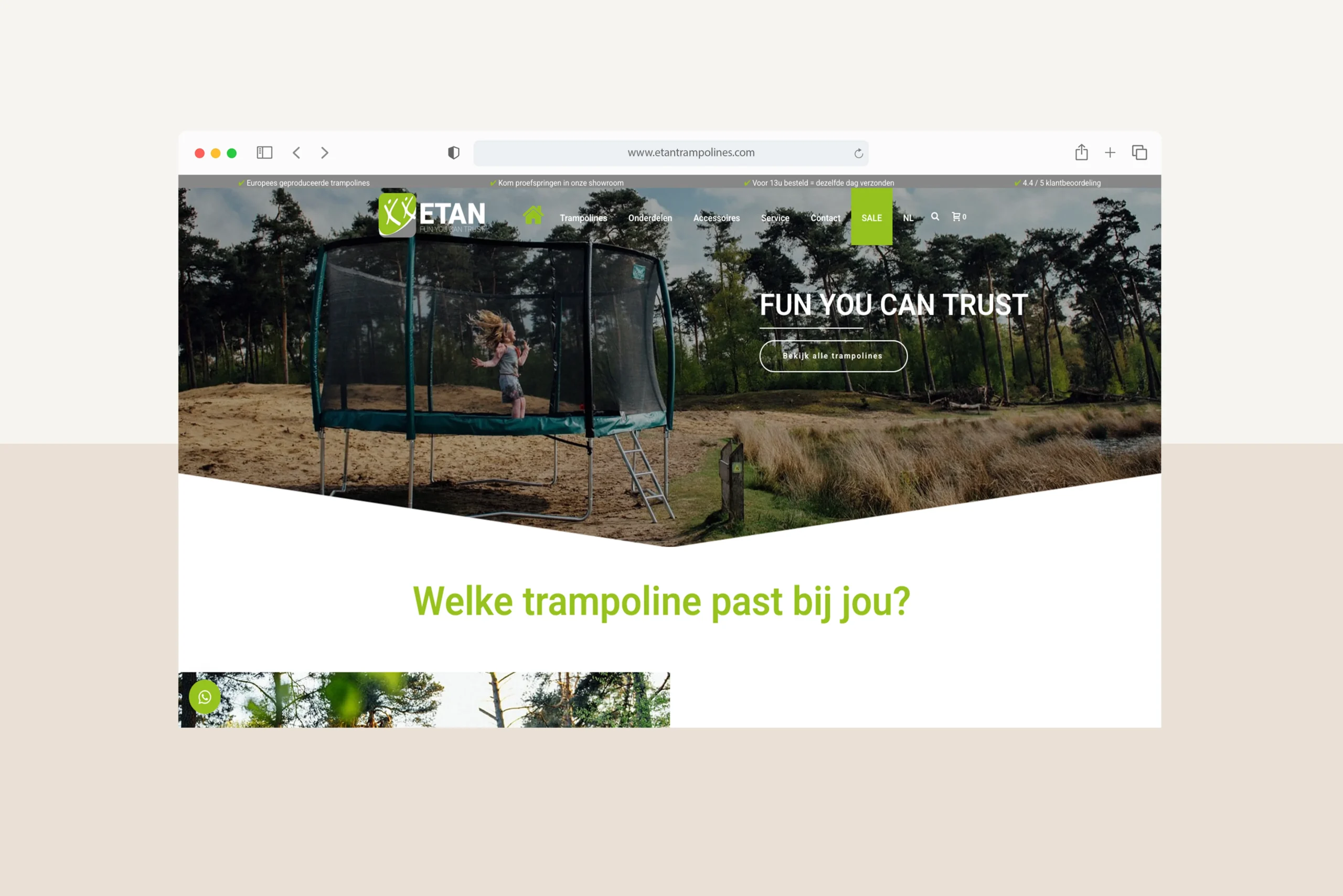 Het in 1998 opgerichte Etan Trampolines B.V. produceert de veiligste high-end trampolines voor jong en oud. Om het bedrijf een modernere uitstraling aan te meten, is ervoor gekozen om het bedrijf te re-branden. Wij hebben ons steentje bijgedragen door de website en de nodige koppelingen en functionaliteiten te bouwen. Zo hebben wij een uitgebreide koppeling gebouwd met Exact Globe, deze hebben we later omgebouwd naar een koppeling (d.m.v. maatwerk WordPress plugin) met AFAS Profit.