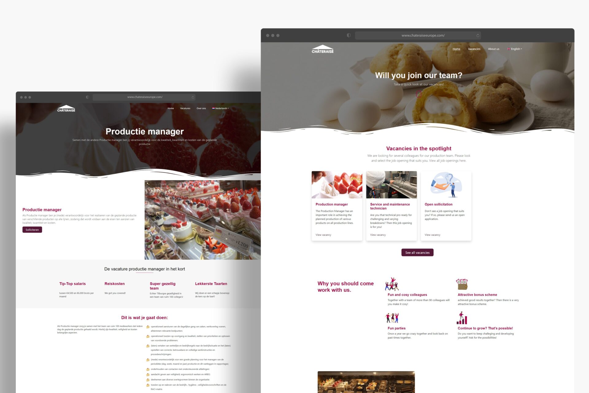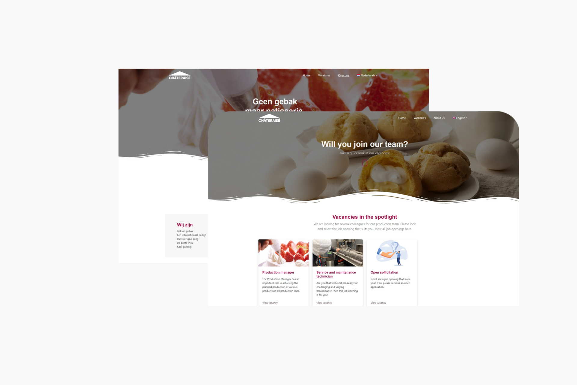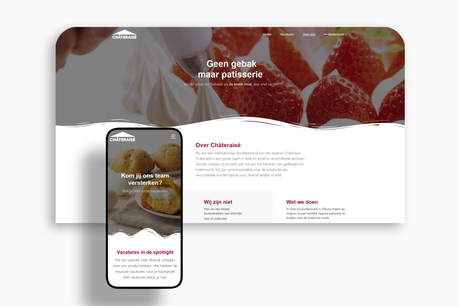 Châteraisé zocht een laagdrempelige manier om nieuwe collega’s te werven in de productie. We hebben een werken-bij website gemaakt die snel duidelijk maakt wat de functies zijn en hoe je reageert. Tweetalig met WPML zodat zowel Nederlandse als internationale kandidaten meteen aansluiten. Wij zorgden voor het ontwerp, de bouw en een strak sollicitatieproces dat uitnodigt om direct te reageren. En dat alles binnen een maatwerk WordPress website.